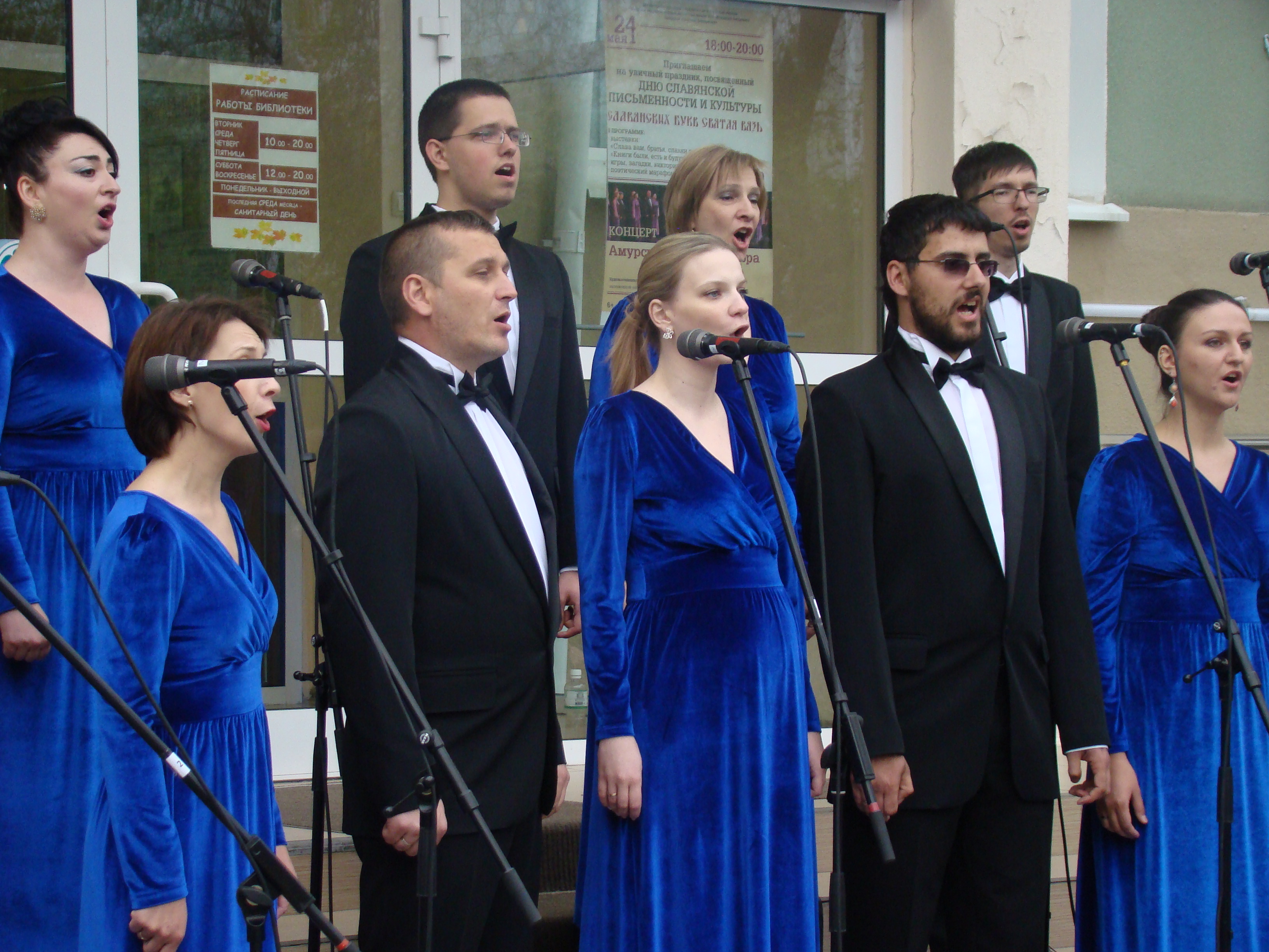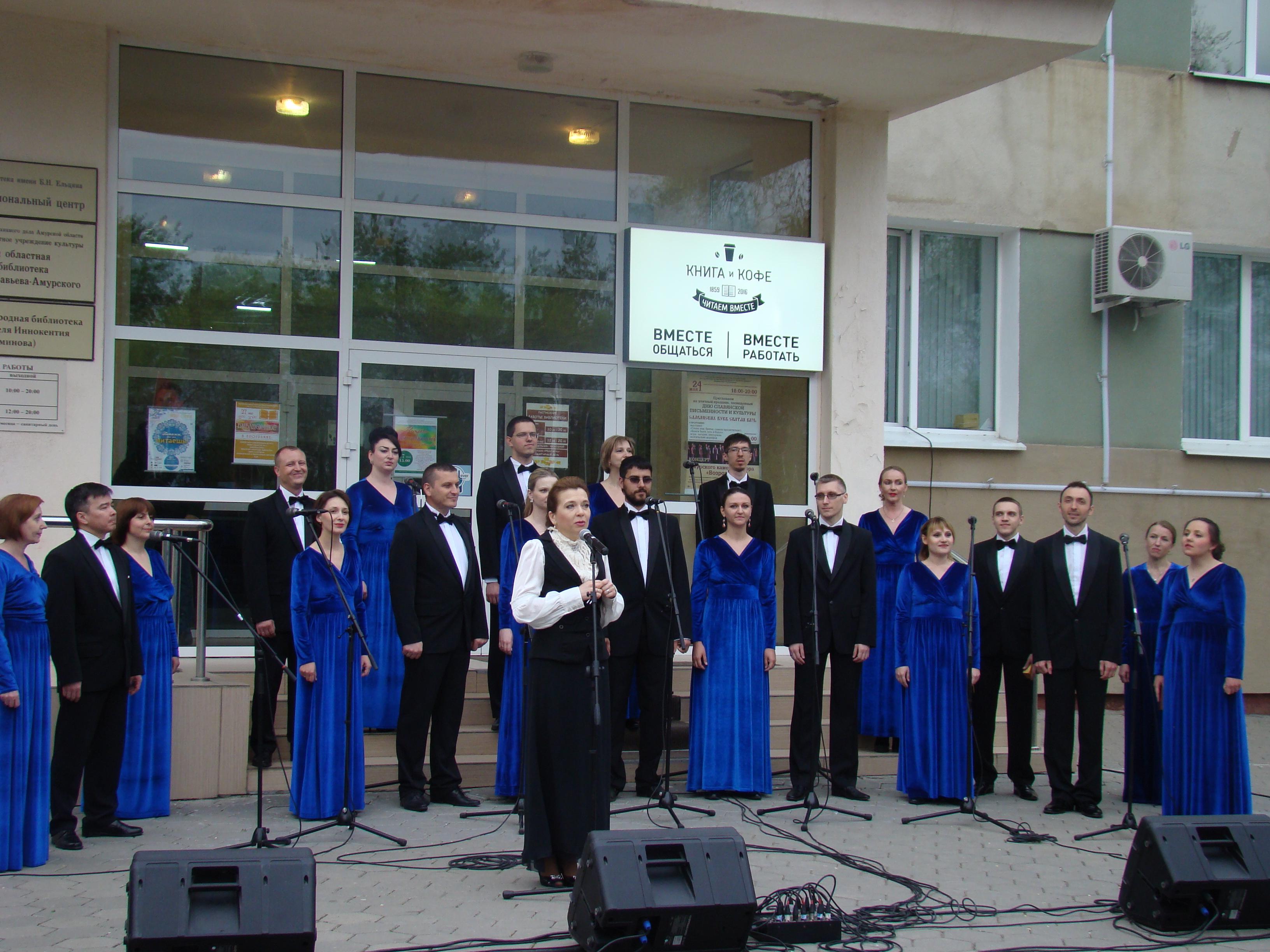 В течение часа, с 19.00 до 20.00, все присутствующие наслаждаслись музыкальными композициями в исполнении Амурского камерного хора «Возрождение», художественный руководитель и дирижер – заслуженный работник культуры Амурской области Елена Беляева.