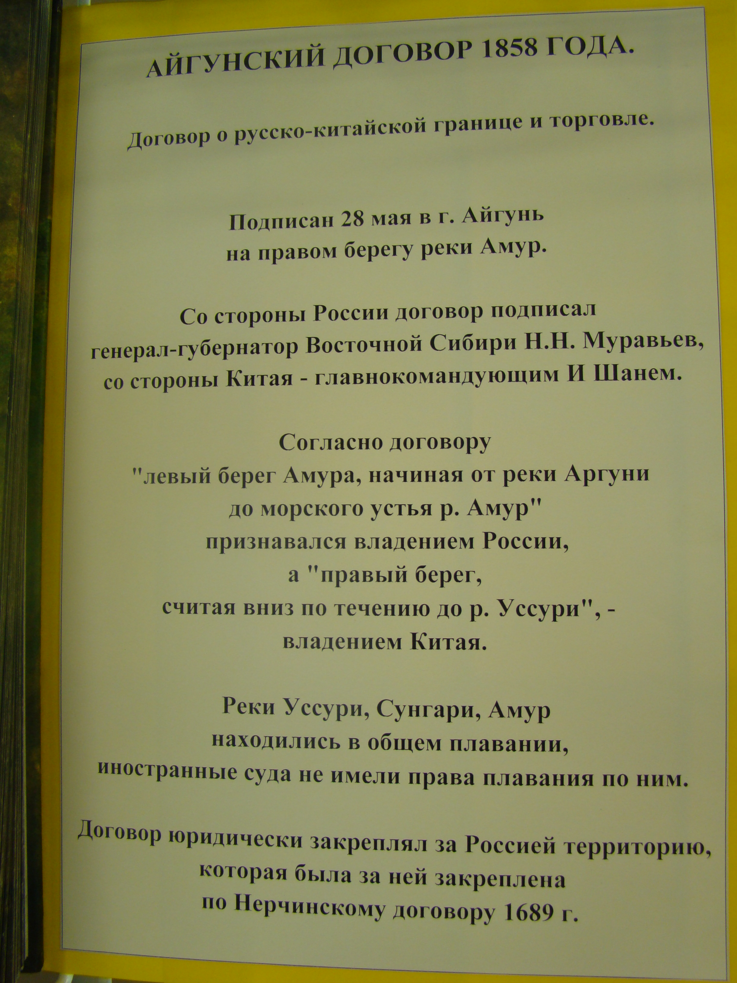 16 (28) мая 1858 года в китайском городе Айгуне в 30-ти верстах от Благовещенска был подписан договор о разграничении территорий в Приамурье. Его положения были закреплены Тяньцзиньским трактатом, а Пекинский договор 1860 года окончательно определил границы между Россией и Китаем. Приамурье и Приморье признавались владениями России.