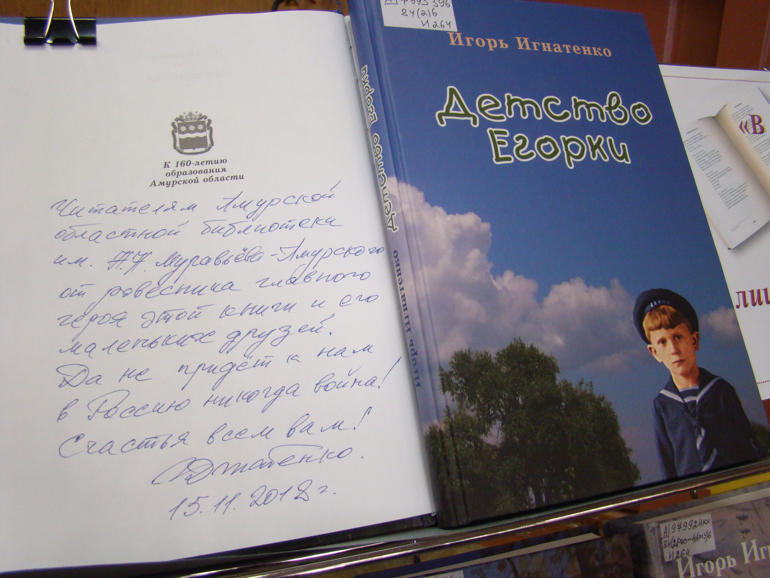 Автор вслед за Егоркой делился воспоминаниями, с болью говорил о своей любимой Украине. «Да не придёт к нам в Россию никогда война! Счастья всем вам!» – написал Игорь Данилович на экземпляре книги, подаренной читателям Амурской областной библиотеки имени Н.Н. Муравьева-Амурского.